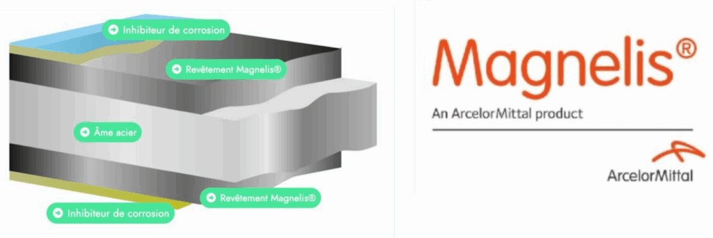 Nous utilisons un acier galvanisé protégé par un rêvetement magnelis permettant une protection anti-corrossion jusqu’à 10 fois supérieures à